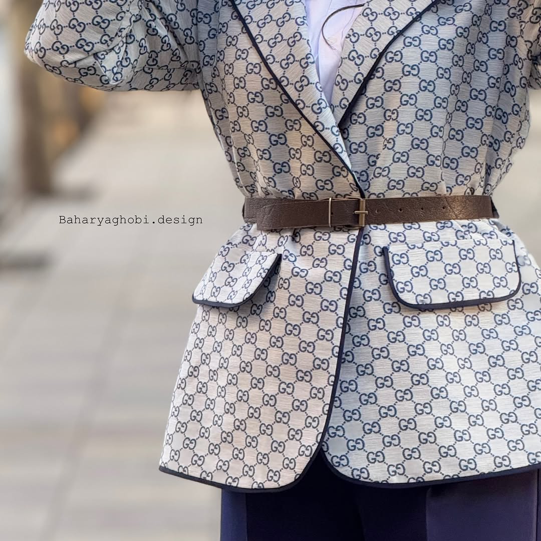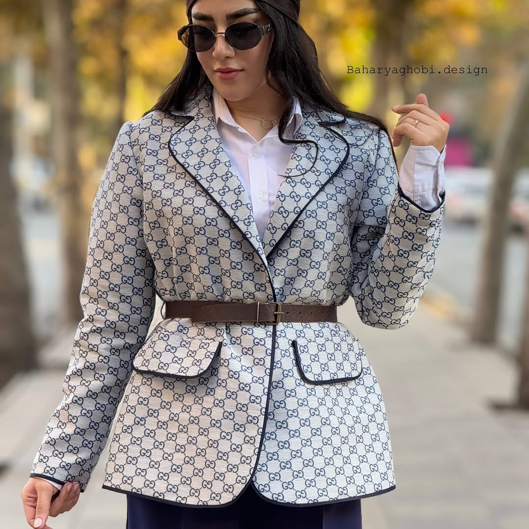 کت با طرح گوچی و رنگ سرمه ای قهوه ای. جنس ژاکارد آستردار و مغزی دوزی شده، مزوندوز چهارفصل. سایز قابل تغییر.