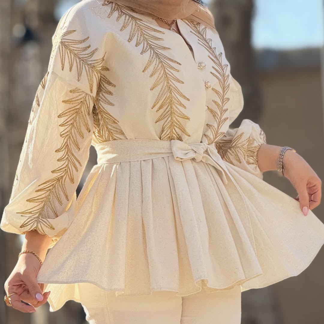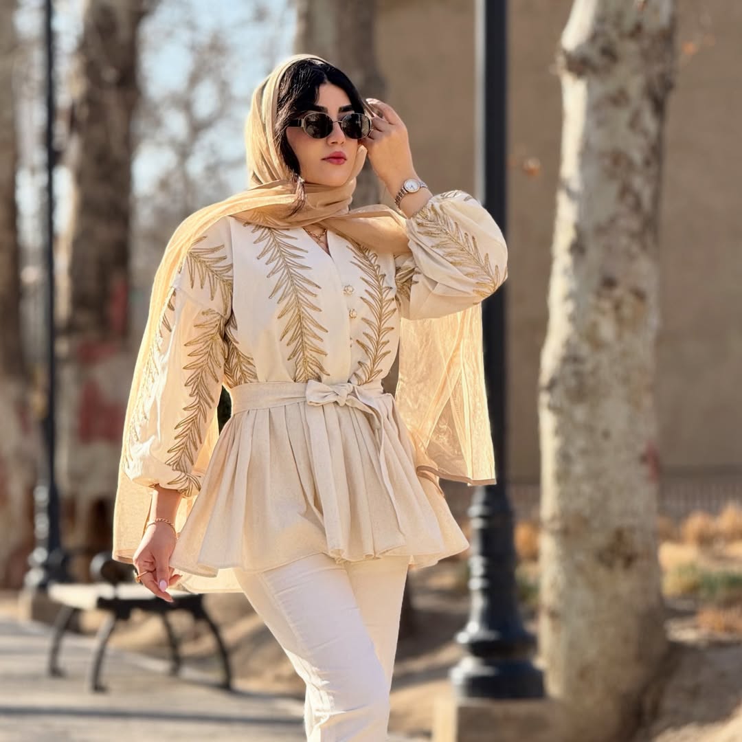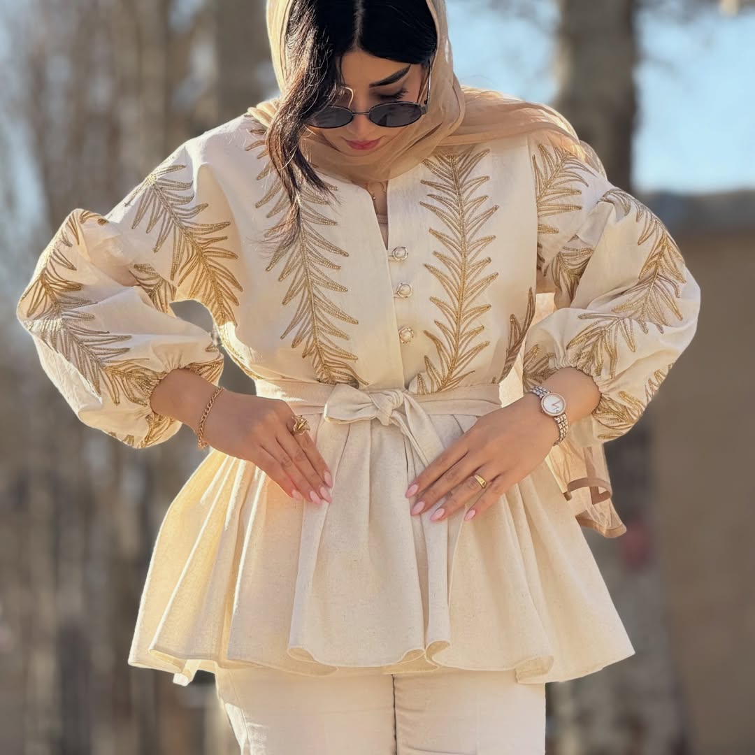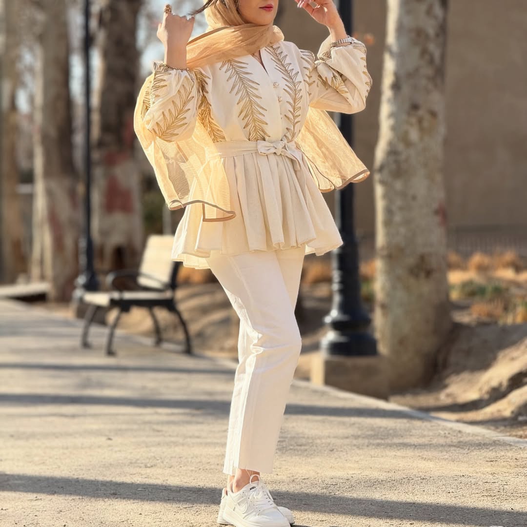 کالکشن بهار ۱۴۰۵ فری سایز ( مناسب سایز ۳۸ تا ۴۴) جنس لینن طلاکوب وارداتی قد ۷۵ ( قد مدل ۱۷۰ ) لمینت شده مزوندوز